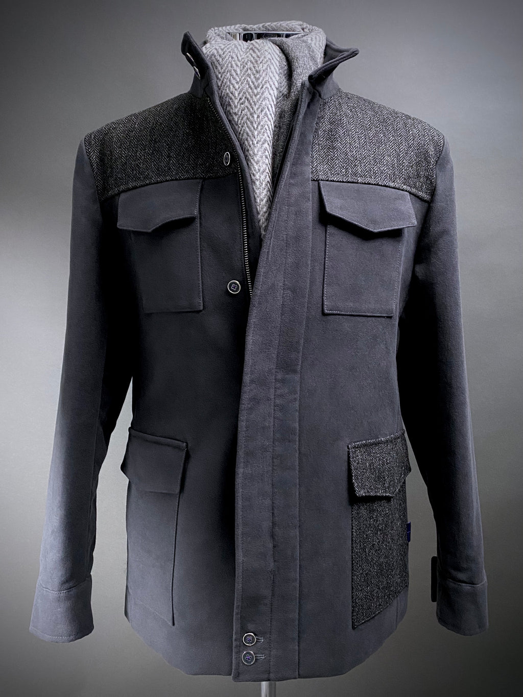 Grey Moleskin and Tweed Utility Coat.